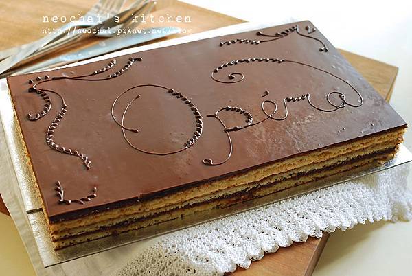 修掉醜醜的四邊後,正中央以巧克力寫下蛋糕芳名opéra,e的上頭記得種顆豆芽菜,