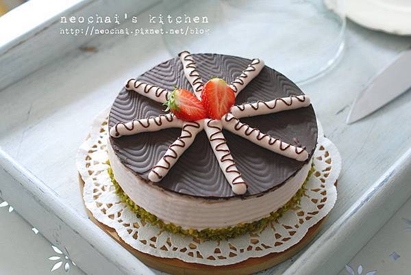 慕斯上再以巧克力擠上同數目連續的S,中間放上草莓就大功告成。